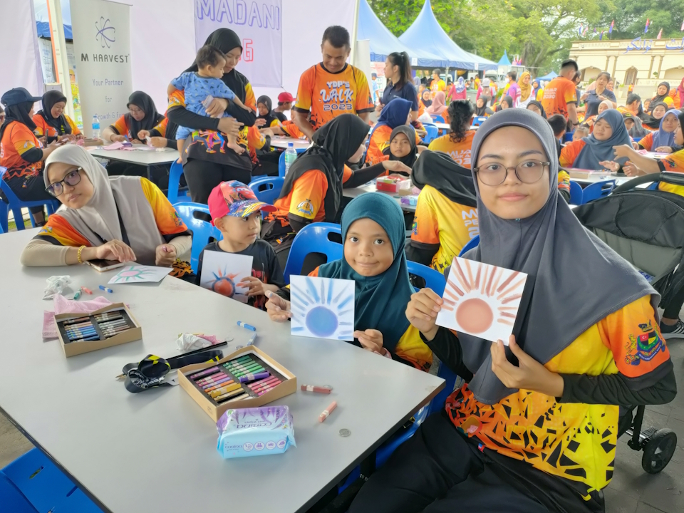 During YDP’s Walk under the Madani Malaysia Program, nearly a thousand participants, including diverse races, military personnel, and persons with disabilities, joined our finger painting activity. Co-organized with JCI, the event promoted harmony, health, stress relief and positivity through creativity and community unity.